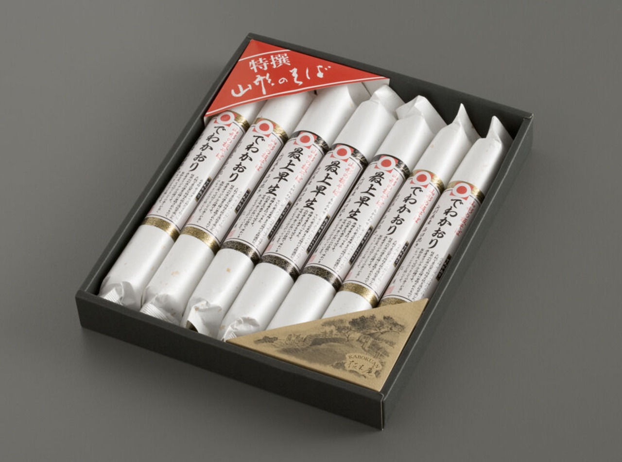 山形県産そば「最上早生」「でわかおり」の詰合せ。石臼挽きした風味豊かなそばを詰め合わせました。少し黒めの最上早生、白めのでわかおりをお楽しみください。